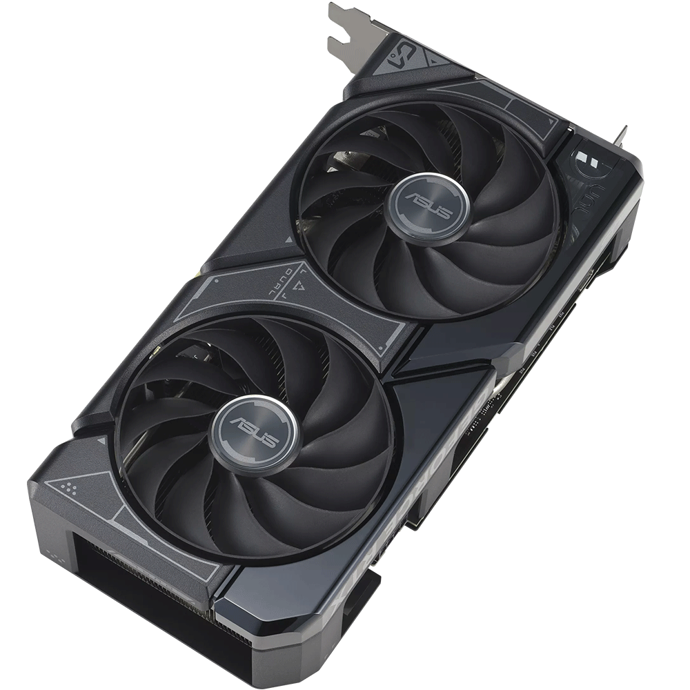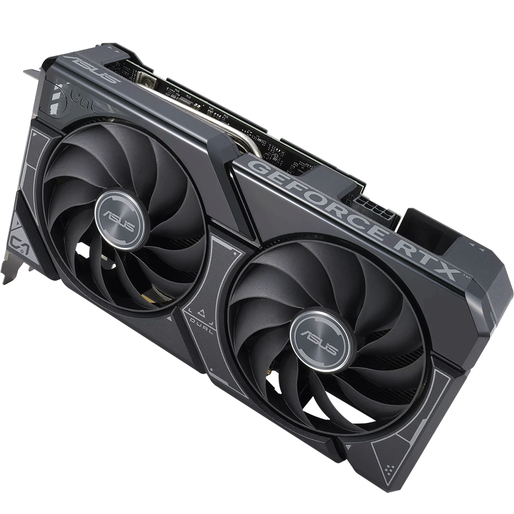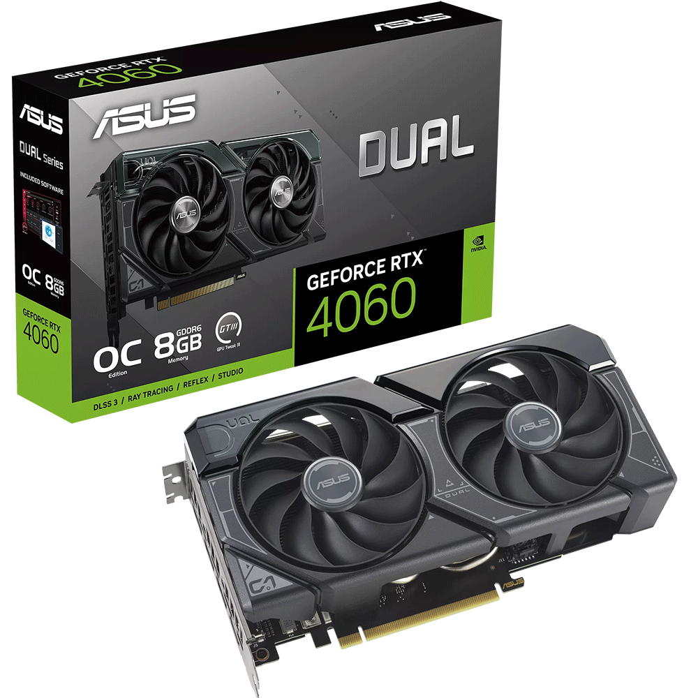- كرت الشاشة ASUS Dual GeForce RTX 4060 OC Edition بذاكرة GDDR6 سعة 8 جيجابايت مزودة بمروحتين قويتين بتقنية Axial وتصميم ذو فتحة 2.5 للتوافق الواسع