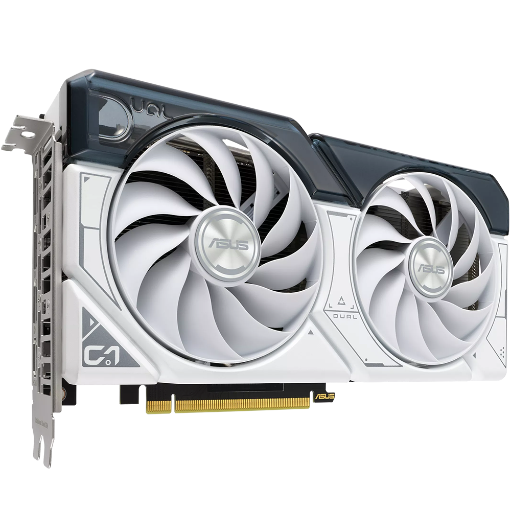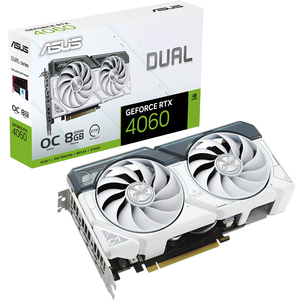 - كرت الشاشة ASUS Dual GeForce RTX 4060 White OC Edition بذاكرة GDDR6 سعة 8 جيجابايت مزودة بمروحتين قويتين بتقنية Axial وتصميم ذو فتحة 2.5 للتوافق الواسع