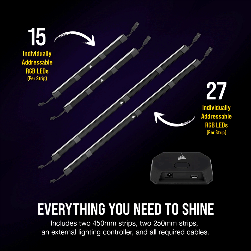- يتضمن على شريطين طويلين (450 مم) مع 27 اضاءة LED قابلة للتخصيص بشكل فردي لكل منهما ، وشريطان قصيران (250 مم) مع 15 اضاءة يمكن تخصيص كل منها على حدة ، ووحدة تحكم إضاءة خارجية ، وكابل USB ، وكابل طاقة خارجي.