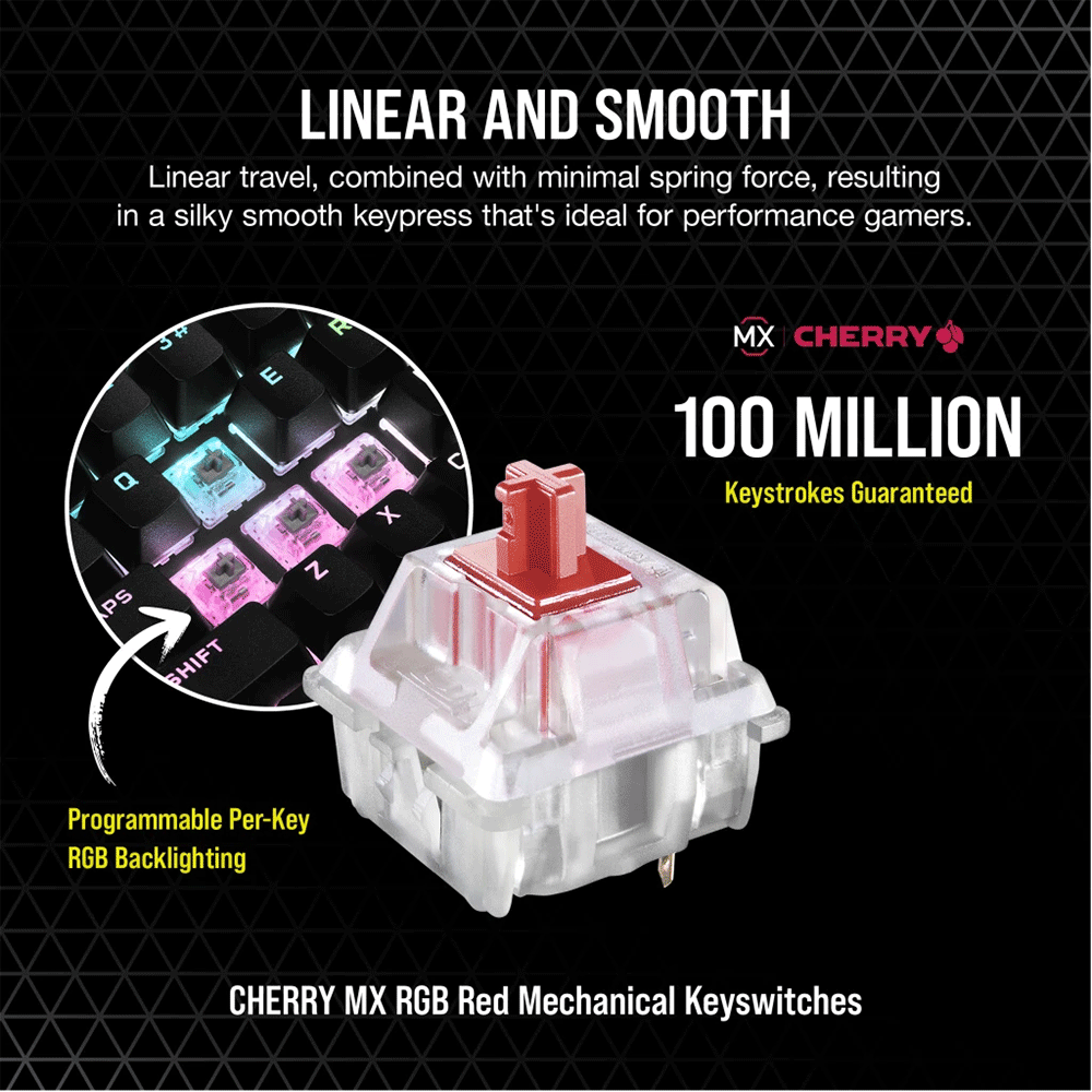 - تتميز مفاتيح CHERRY MX Red بنقل خطي ، جنبًا إلى جنب مع الحد الأدنى من قوة الزنبرك ، مما ينتج عنه ضغط مفتاح سلس ناعم ومثالي للاعبين ذوي الأداء العالي.