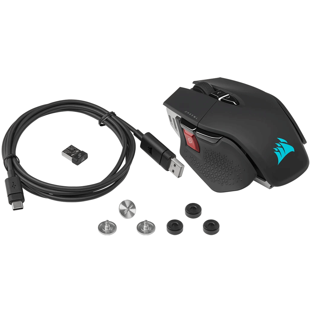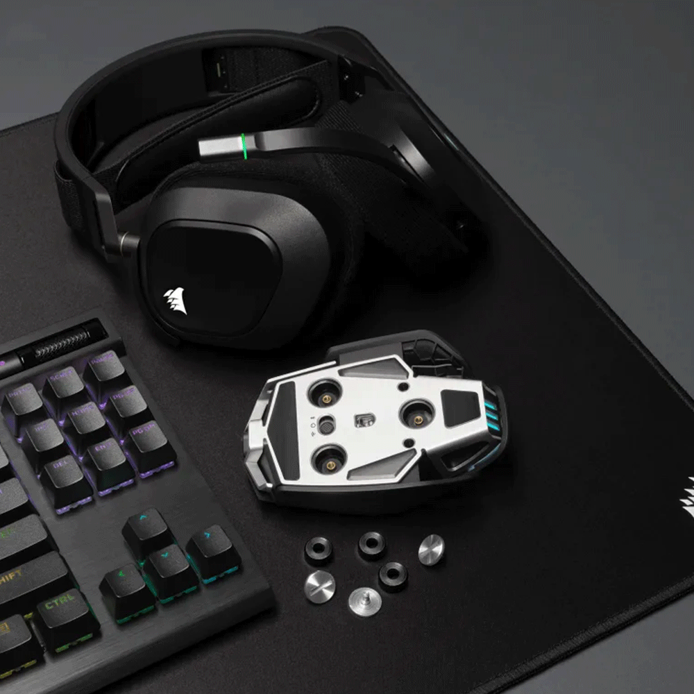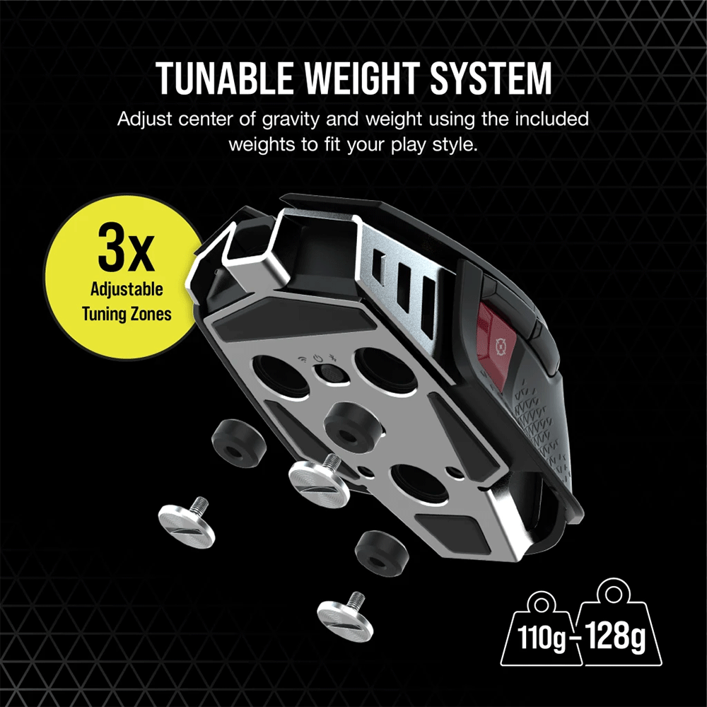 - اضبط مركز الثقل والوزن M65 RGB ULTRA WIRELESS من 110 جم - 128 جم باستخدام ما يصل إلى ستة أوزان متضمنة.