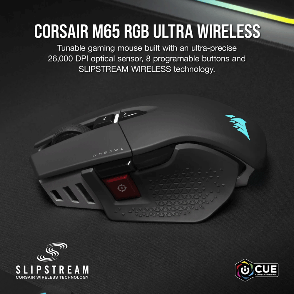 - اجعل كل نقراتك مفيدة مع ماوس الألعاب CORSAIR M65 RGB ULTRA WIRELESS Tunable ، الذي يتميز بإطار من الألمنيوم المتين ، وسرعة فائقة SLIPSTREAM WIRELESS ، ومستشعر بصري MARKSMAN 26000 DPI .