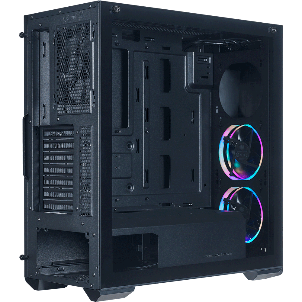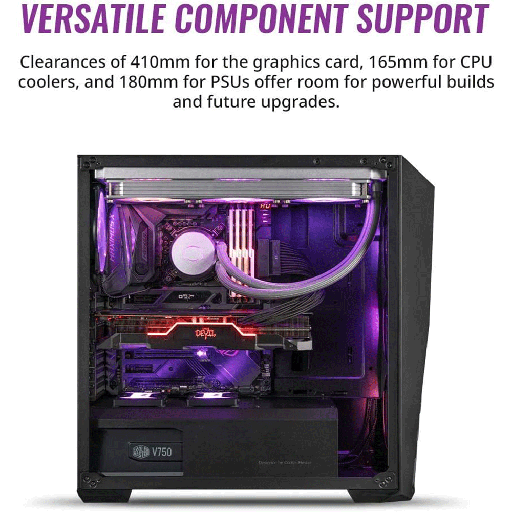 ⚙️ مساحة داخلية واسعة: يوفر مساحة كافية لتركيب بطاقات الرسومات الكبيرة (حتى 410 مم)، والمبردات الهوائية والمائية، بالإضافة إلى ما يصل إلى 4 وحدات تخزين SSD أو HDD.