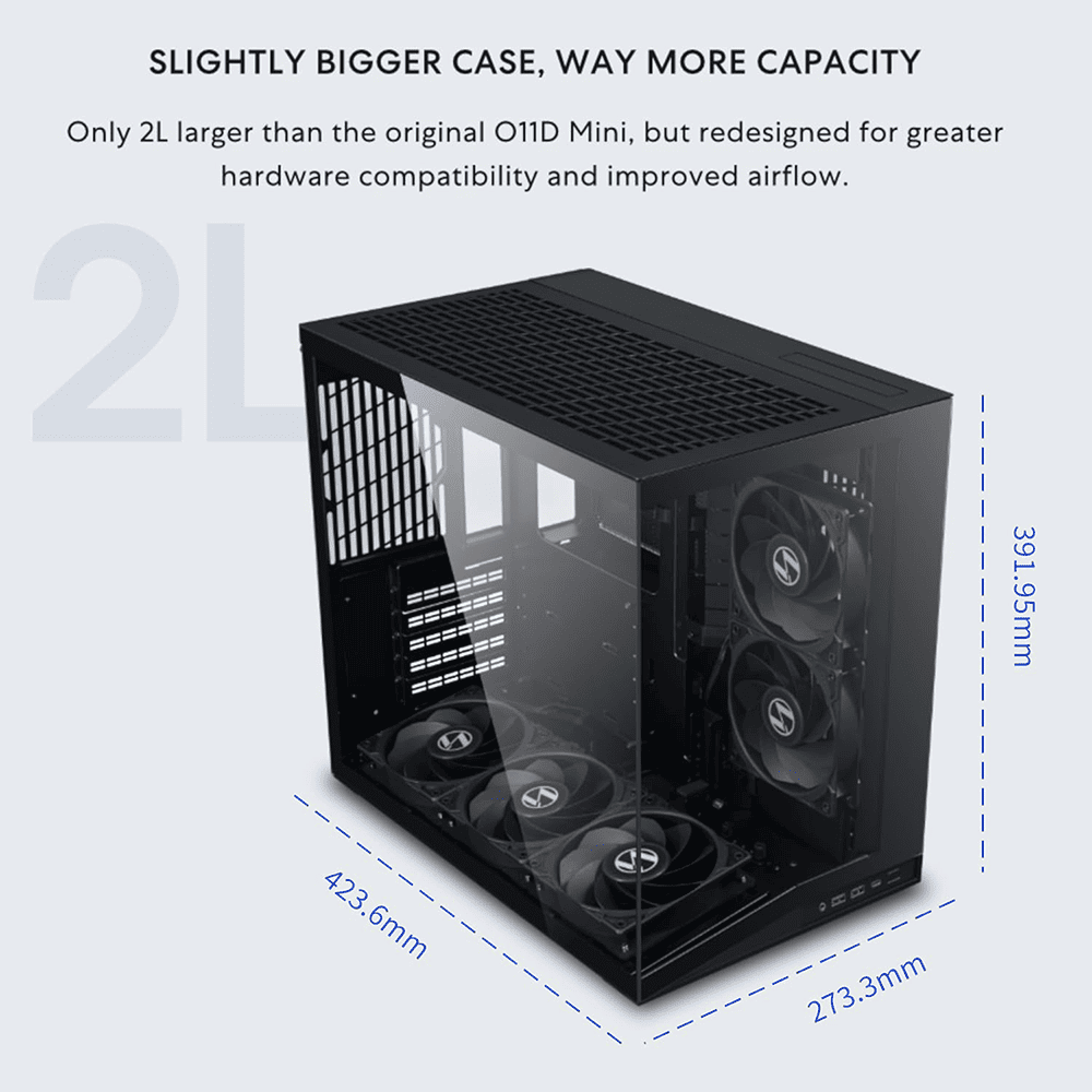 - أكبر بـ 2 لتر فقط من O11D Mini الأصلي، ولكن تم إعادة تصميمه لتوفير توافق أكبر مع الأجهزة وتحسين تدفق الهواء.