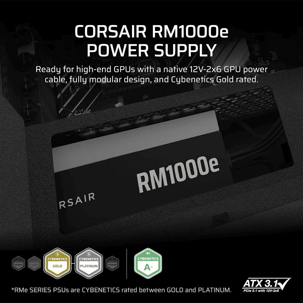 - يتطلب معيار ATX 3.1 مستوى عالٍ من الموثوقية وكفاءة الطاقة. في حين أن العديد من وحدات تزويد الطاقة CORSAIR تفي بهذه المتطلبات، فإن وحدات تزويد الطاقة من سلسلة RMe معتمدة رسميًا لتوافقها مع ATX 3.1.