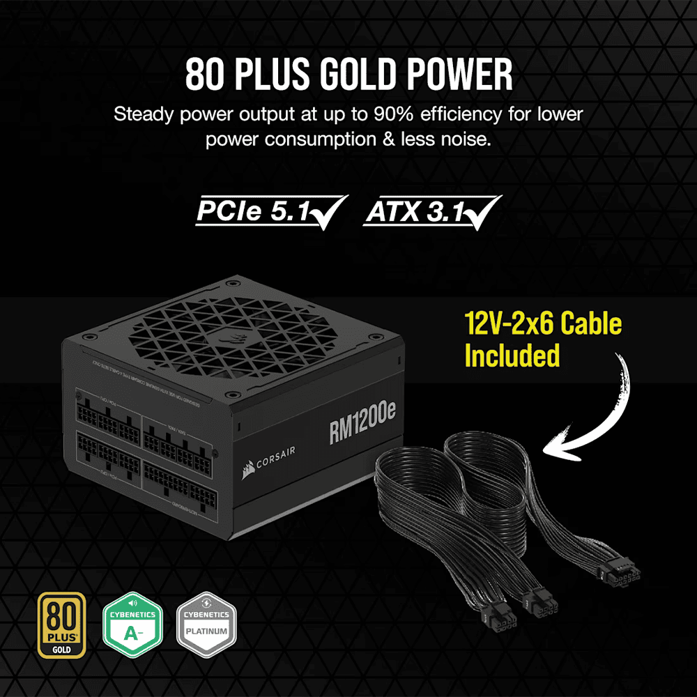 - تشتمل مزودات الطاقة منخفضة الضوضاء والقابلة للتعديل بالكامل من سلسلة CORSAIR RMe على كابل طاقة مخصص 12V-2x6 GPU، وشهادة ATX 3.1 ومطابقة PCIe 5.1، وكفاءة Cybenetics™ Gold لتصميم هادئ وموثوق. كما يتيح الحجم الصغير لمزودات الطاقة RMe سهولة إدارة الكابلات.
