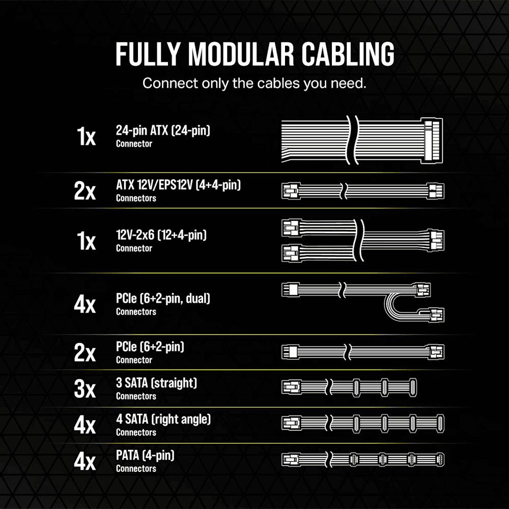 - تخلص من فوضى الكابلات عن طريق توصيل الكابلات التي يحتاجها نظامك فقط. موصل GPU أصلي 600W 12V-2x6 وموصلات PCIe متعددة 8pin تعني أن مزودات الطاقة RMe تلبي احتياجات وحدات GPU و CPU الحديثة والمستقبلية.