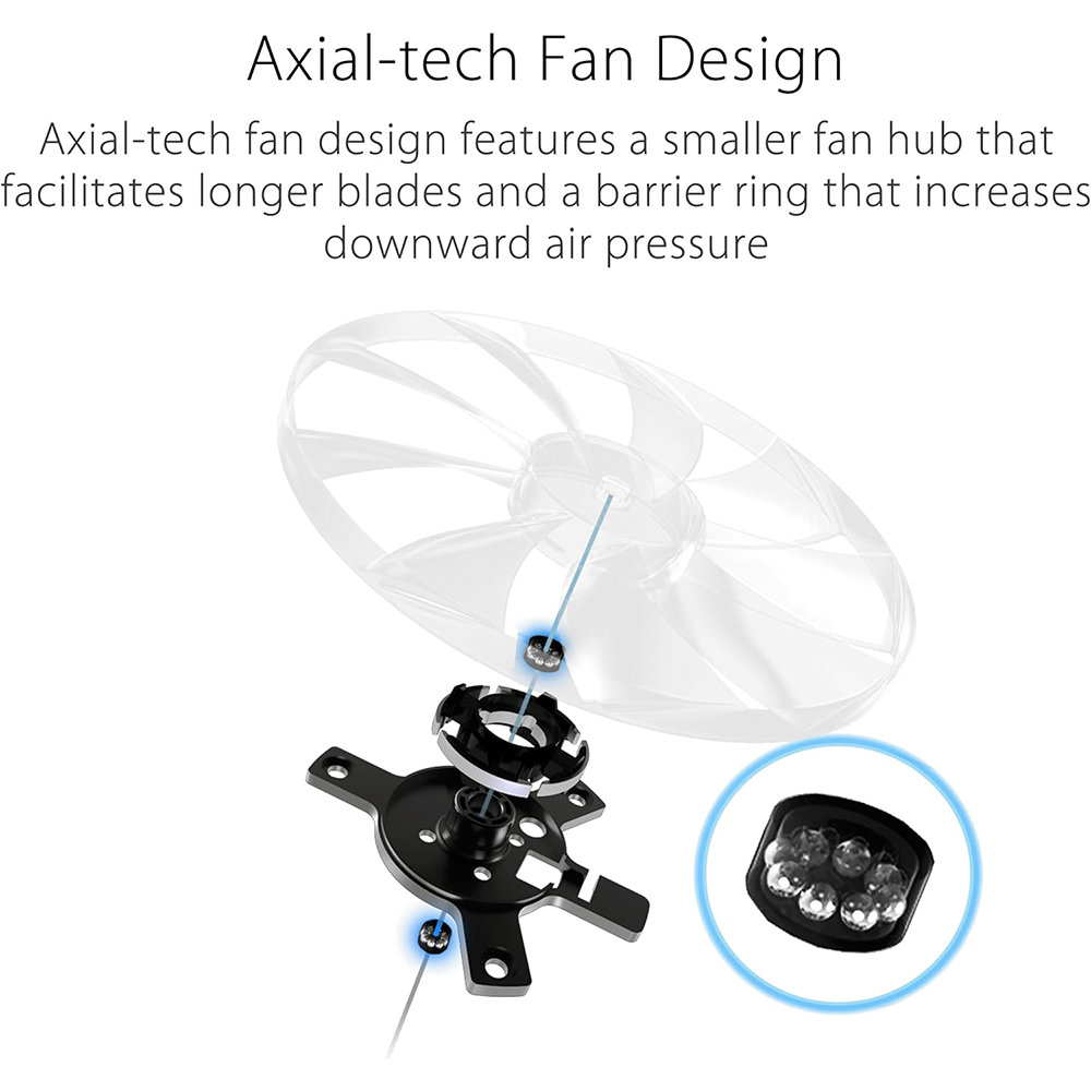 - يتميز تصميم المروحة بتقنية Axial-tech بمحور مروحة أصغر يسهل استخدام الشفرات الأطول وحلقة حاجزة تعمل على زيادة ضغط الهواء نحو الأسفل.
