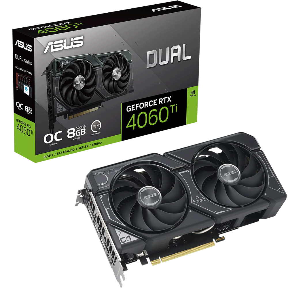 - ASUS Dual GeForce RTX 4060 Ti OC Edition 8GB GDDR6 with two powerful Axial-tech fans and a 2.5-slot design for broad compatibility