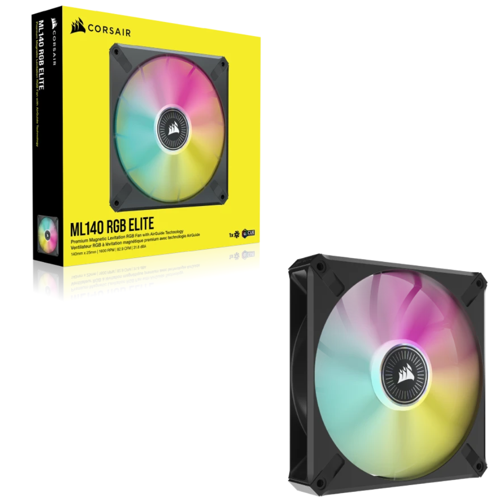 - Add another CORSAIR iCUE ML140 RGB ELITE Premium 140mm PWM Magnetic Levitation Fan to your ML RGB ELITE-cooled system, boasting CORSAIR AirGuide technology and a magnetic levitation bearing.