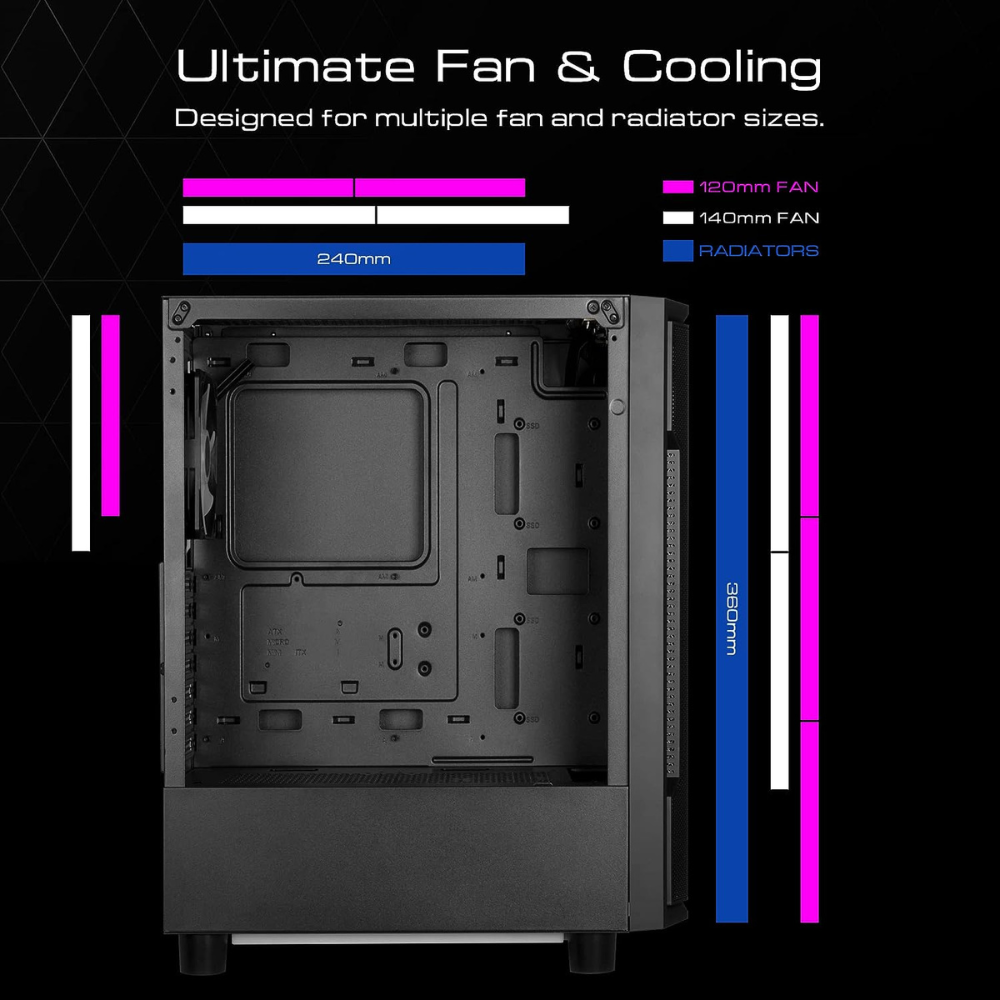 - The case supports up to 6 fans and up to a 360mm radiator in the front and 240mm at the top.