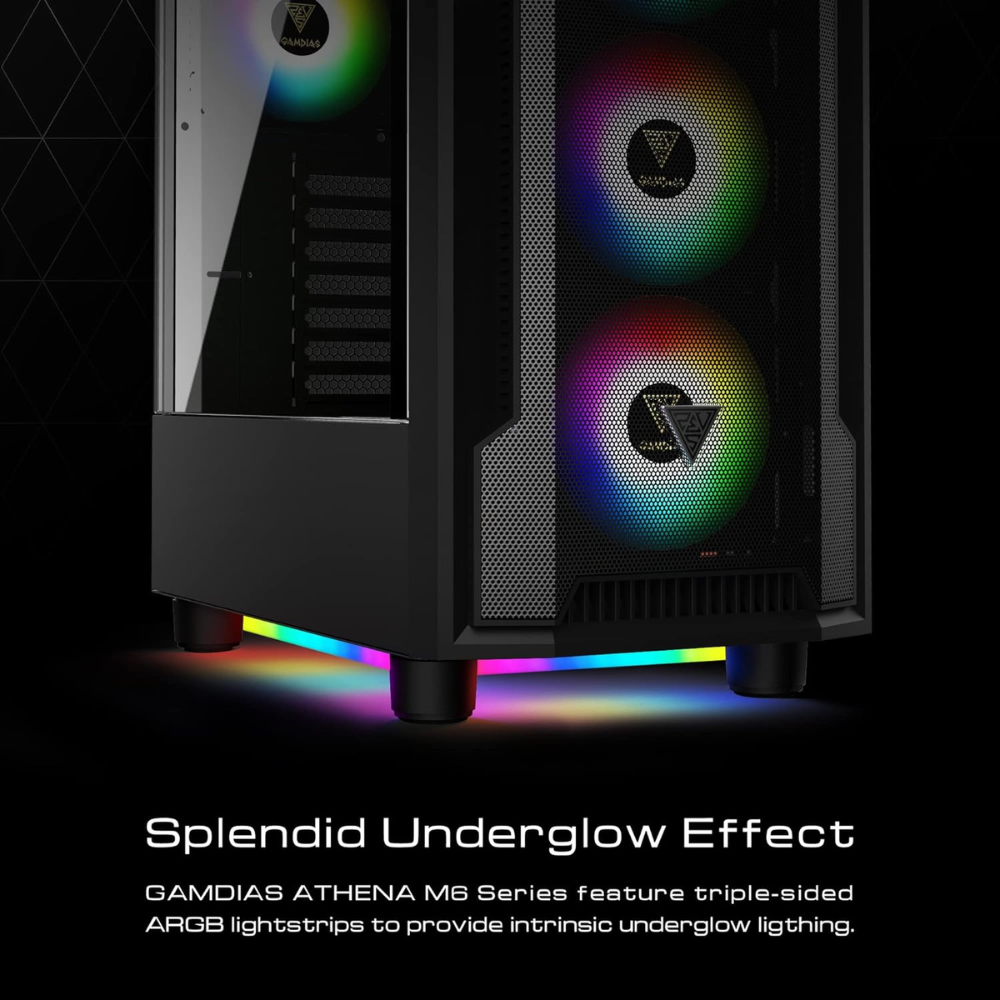 - ATHENA M6 LITE is a mid-tower case with a unique lighting profile focused on optimizing airflow performance. The case features a panoramic mesh front panel, four built-in 120mm ARGB fans, and triple-sided ARGB light strips to leverage airflow performance and create ambient underglow lighting effects.
