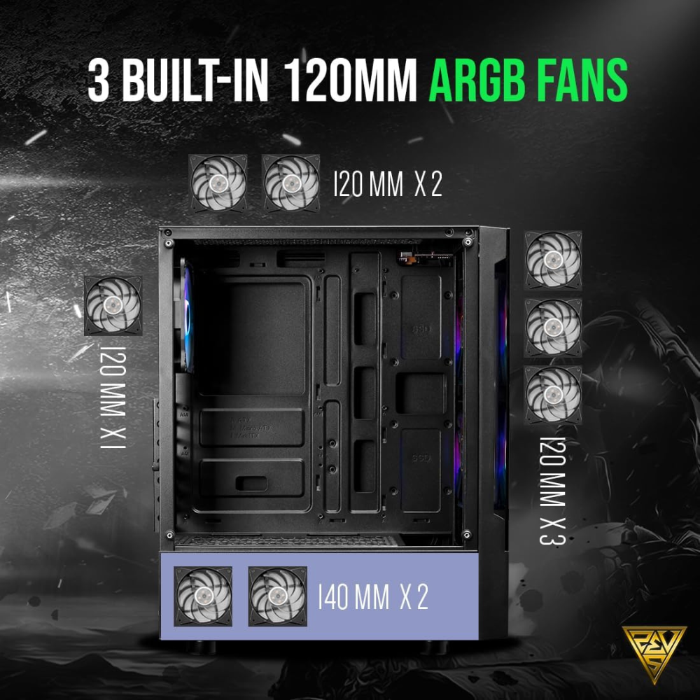 - The case is well equipped with 4 built-in 120mm ARGB fans displayed in full by the mesh front panel and the tempered glass side panel.