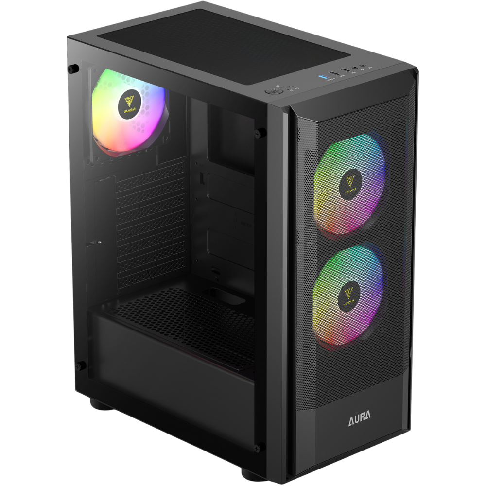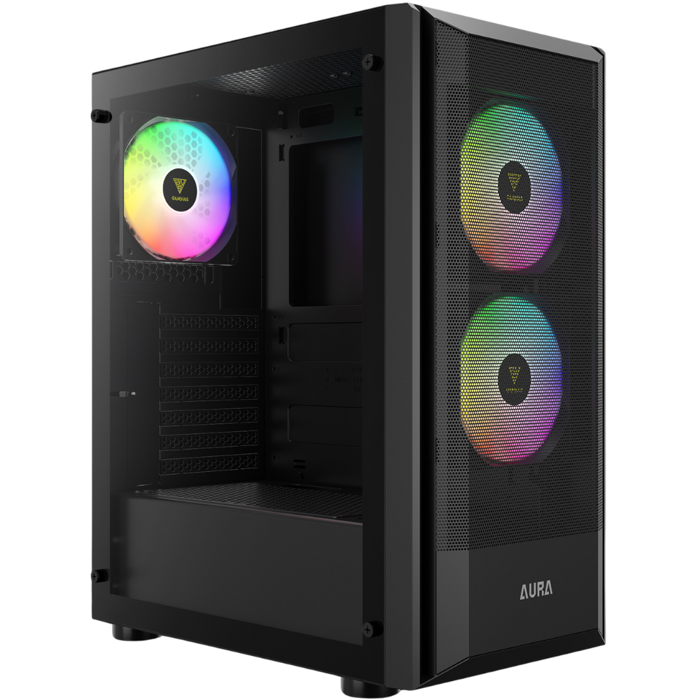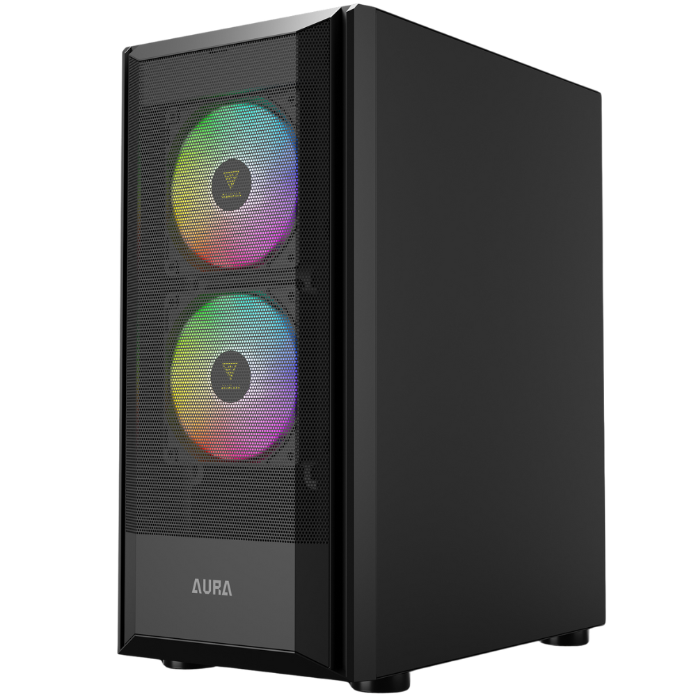 - The AURA GC6 is an affordable mid-tower case that provides a sleek and modish design. The case includes a fully perforated fine mesh front panel for efficient airflow, 3 pre-installed ARGB fans, spacious internals, and a panoramic tempered glass to showcase your build.
