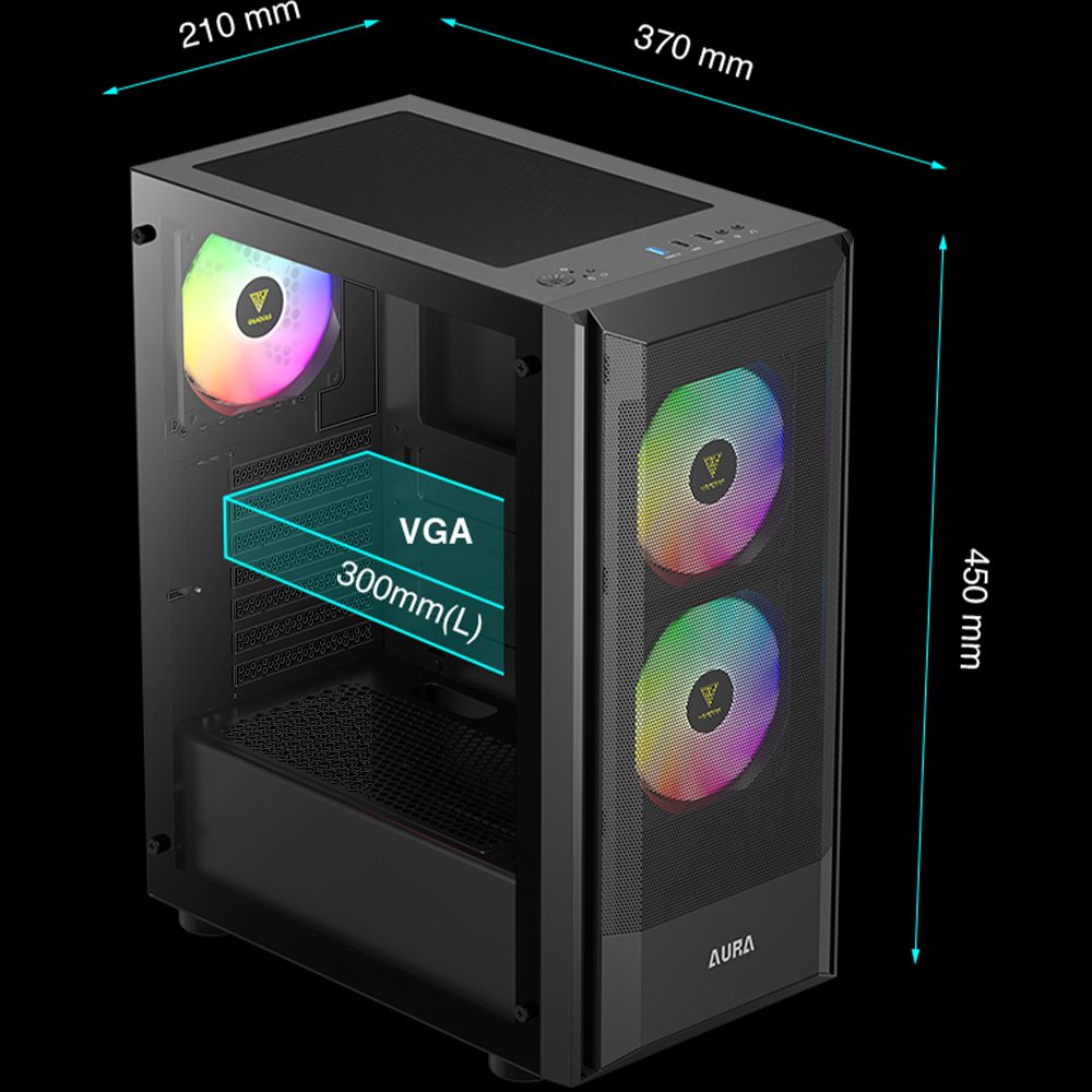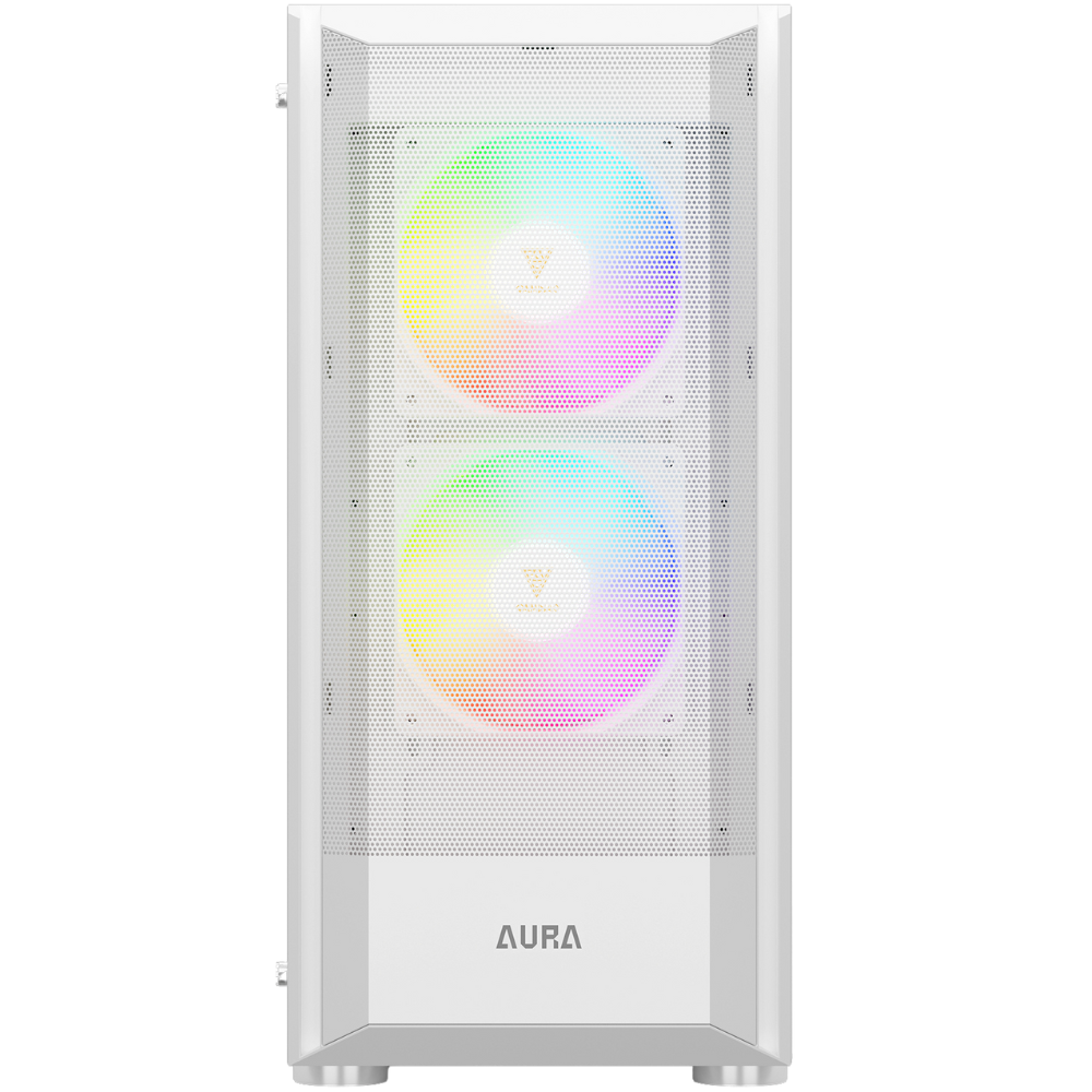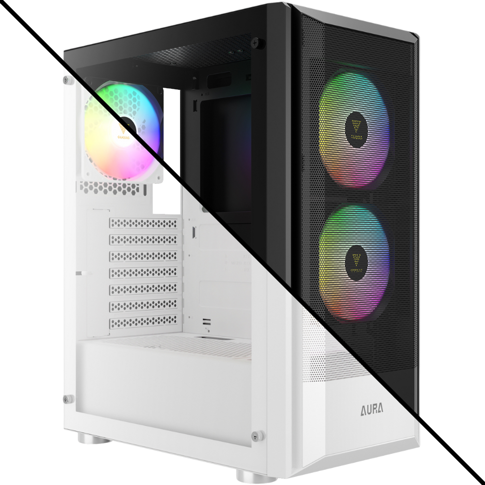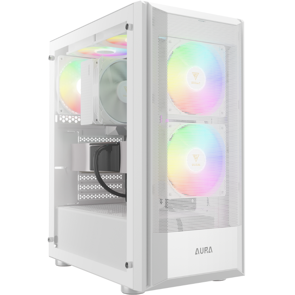 - The AURA GC6 is an affordable mid-tower case that provides a sleek and modish design. The case includes a fully perforated fine mesh front panel for efficient airflow, 3 pre-installed ARGB fans, spacious internals, and a panoramic tempered glass to showcase your build.