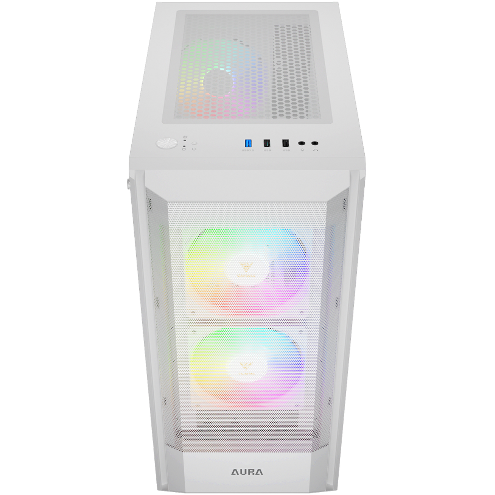 - AURA GC6 comes with a sleek, three sided fine mesh front panel equipped with 3 ARGB fans to provide efficient airflow throughout the case.