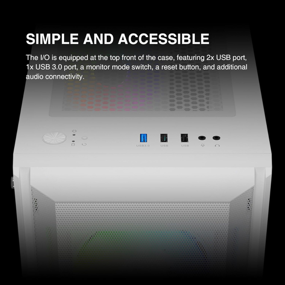 - The I/O is equipped at the top front of the case, featuring 2x USB port, 1x USB 3.0 port, a reset button, and additional audio connectivity.