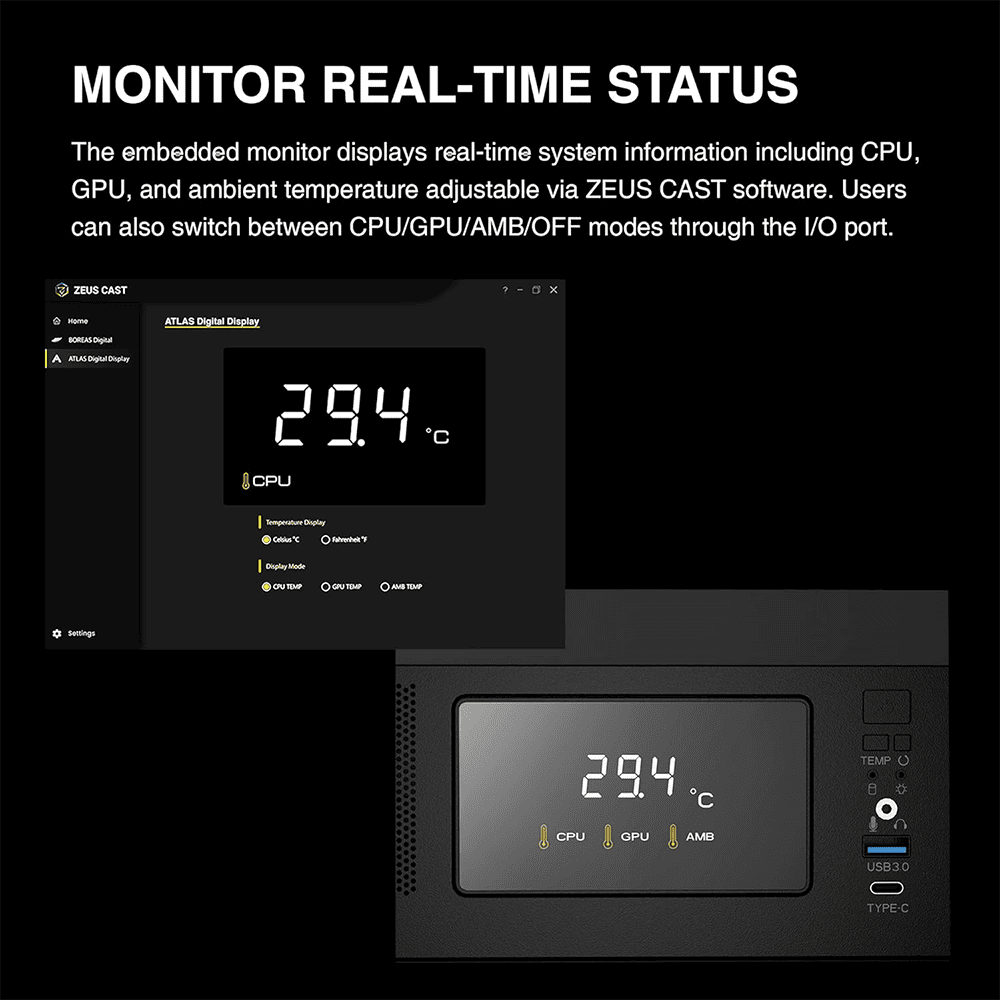 - The embedded monitor displays real-time system information including CPU, GPU, and ambient temperature adjustable via ZEUS CAST software. Users can also switch between CPU/GPU/AMB/OFF modes through the I/O port.