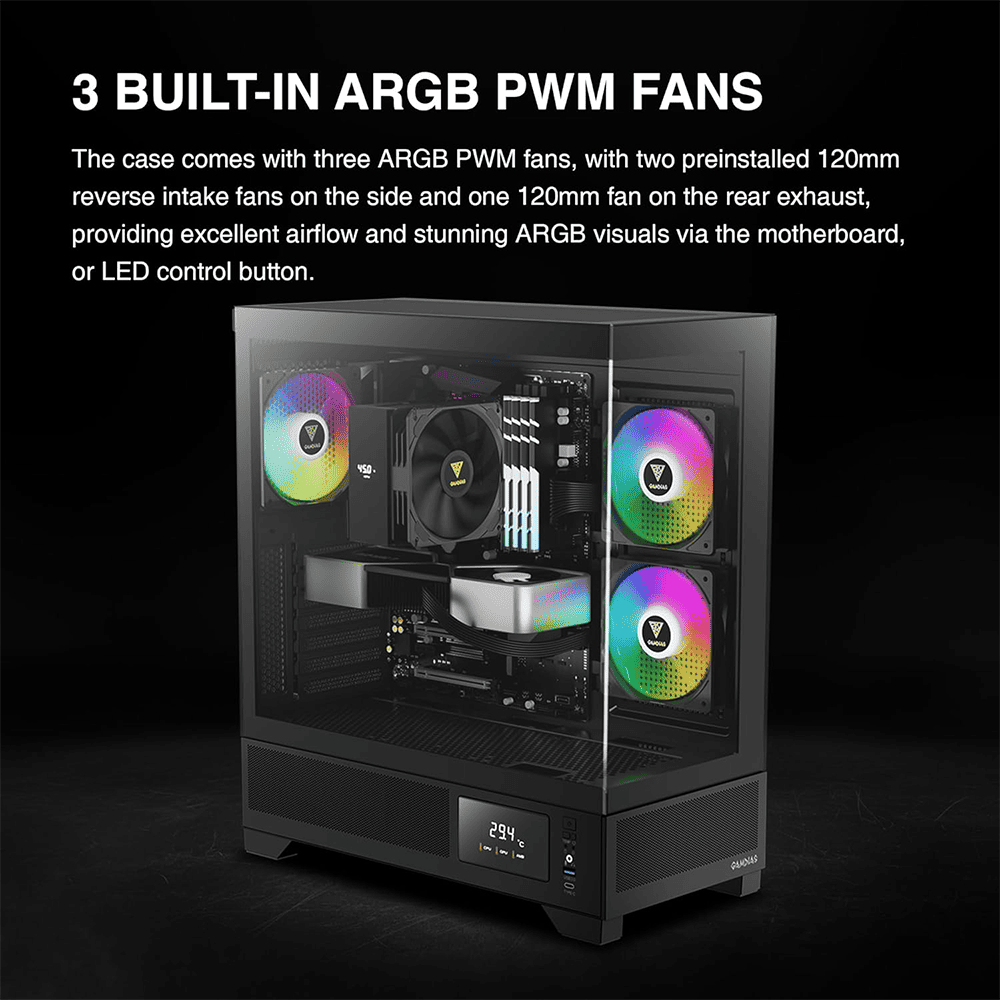 - Featuring three built-in PWM ARGB fans, the case can provide exceptional lighting and fine-tuned airflow. Additionally, it includes a 6-port PWM ARGB fan hub, allowing for easy management and synchronization, ensuring a cohesive lighting setup.