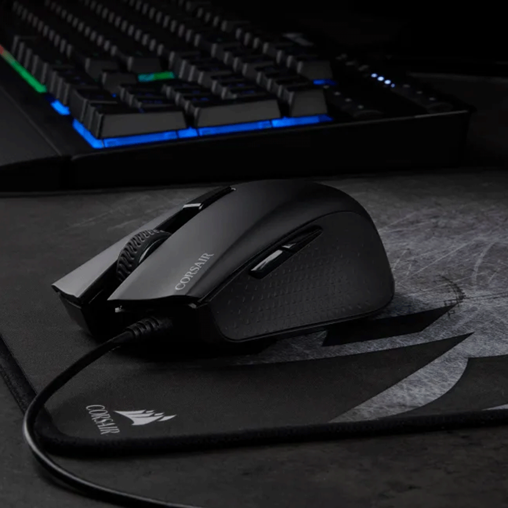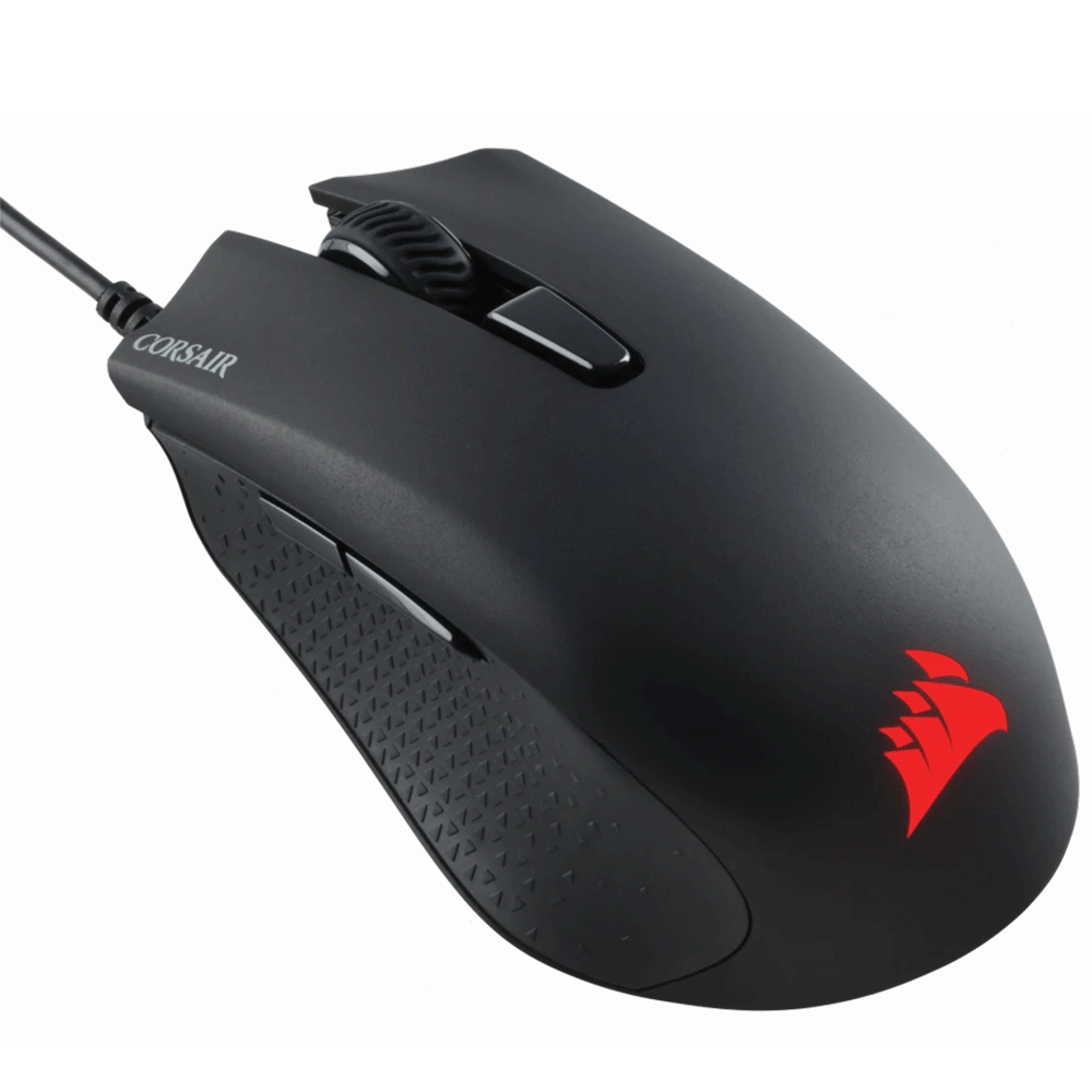 The CORSAIR HARPOON RGB PRO gaming mouse sports a comfortable contoured shape, a 12,000 dpi sensor, and weighs an incredibly light 85g for endless hours of effortless gaming.