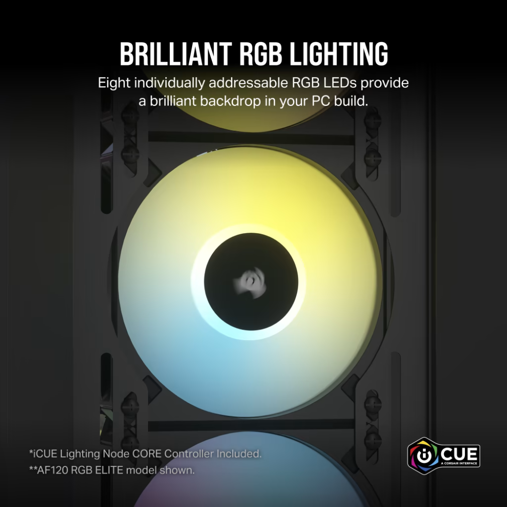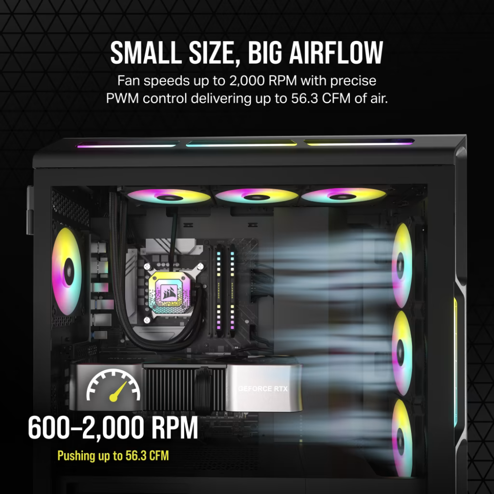 - Make your SFF PC shine with eight individually addressable RGB LEDs per fan, controlled by a CORSAIR iCUE Lighting Node CORE.
