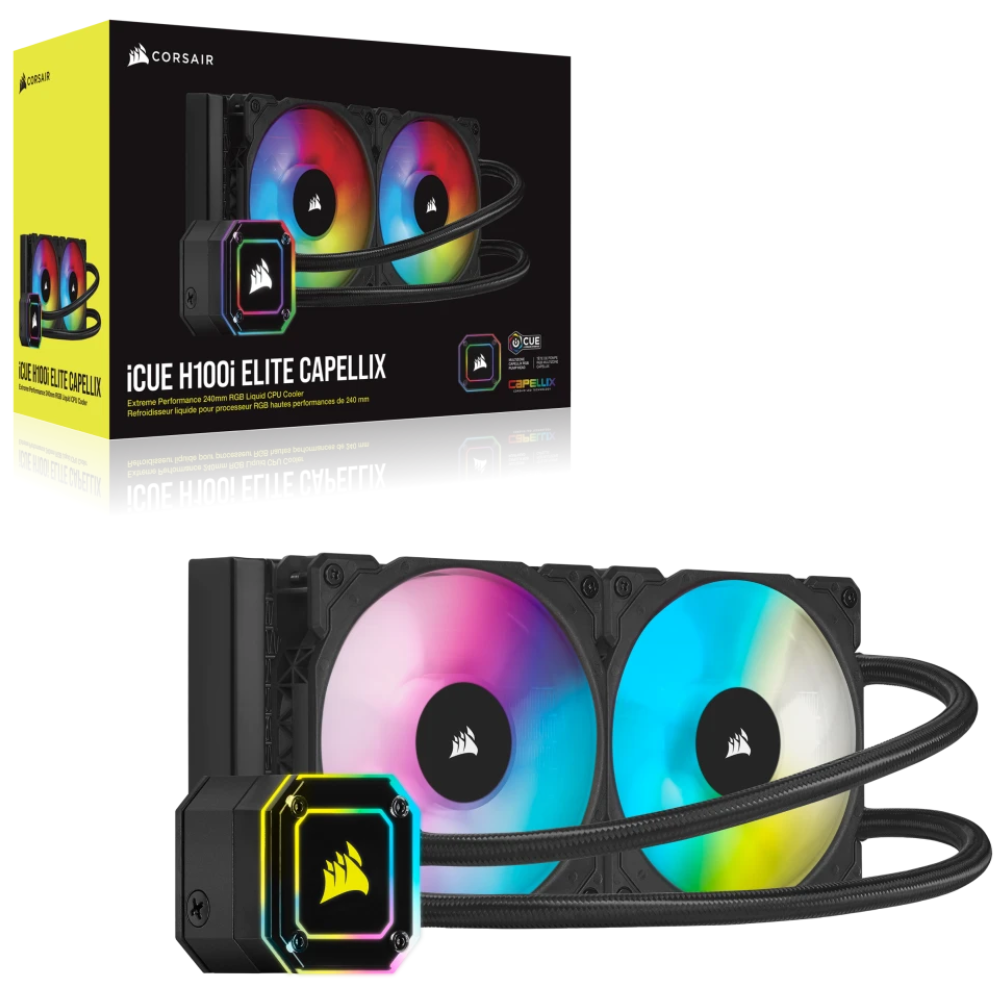 - The CORSAIR iCUE H100i ELITE CAPELLIX Liquid CPU Cooler provides powerful, low-noise cooling for your CPU, with a 240mm radiator, CORSAIR ML120 RGB PWM fans, and an ultra-bright CAPELLIX RGB pump head.