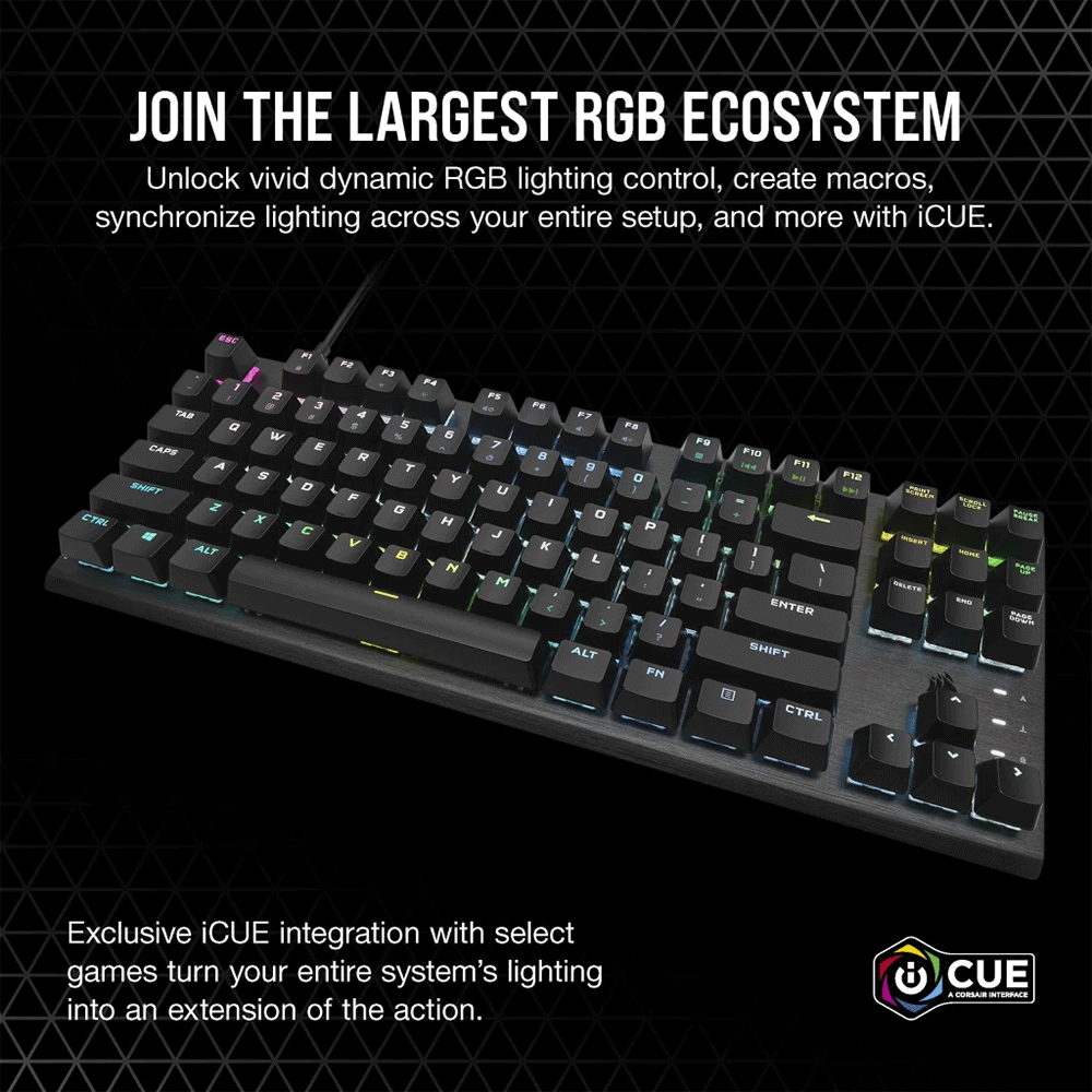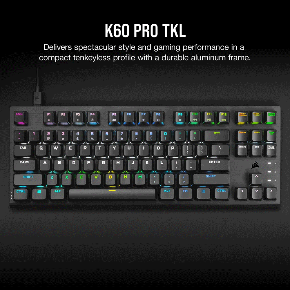 - The CORSAIR K60 PRO TKL RGB Tenkeyless Optical-Mechanical Gaming Keyboard delivers compact style and high performance, with CORSAIR OPX optical-mechanical keyswitches and a durable brushed aluminum frame.