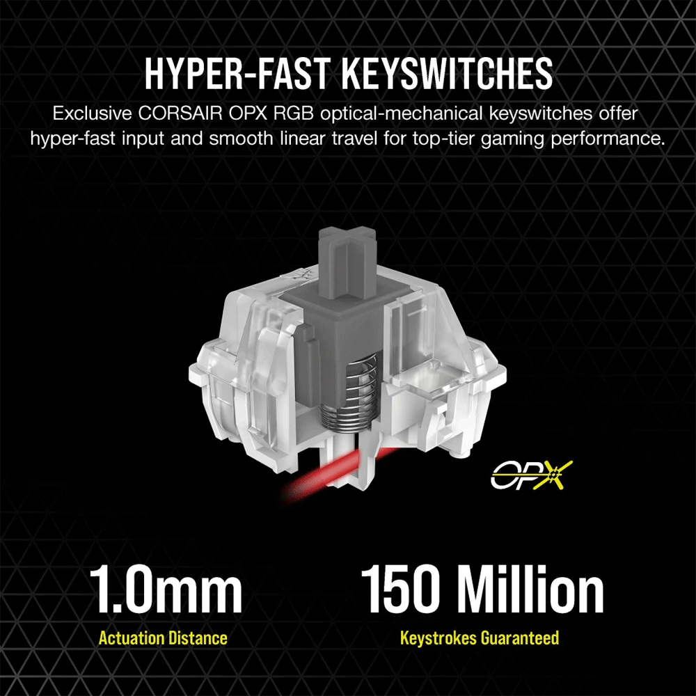 - Exclusive CORSAIR OPX optical-mechanical keyswitches offer hyper-fast input with just 1.0mm actuation distance and smooth linear travel for top-tier gaming performance.