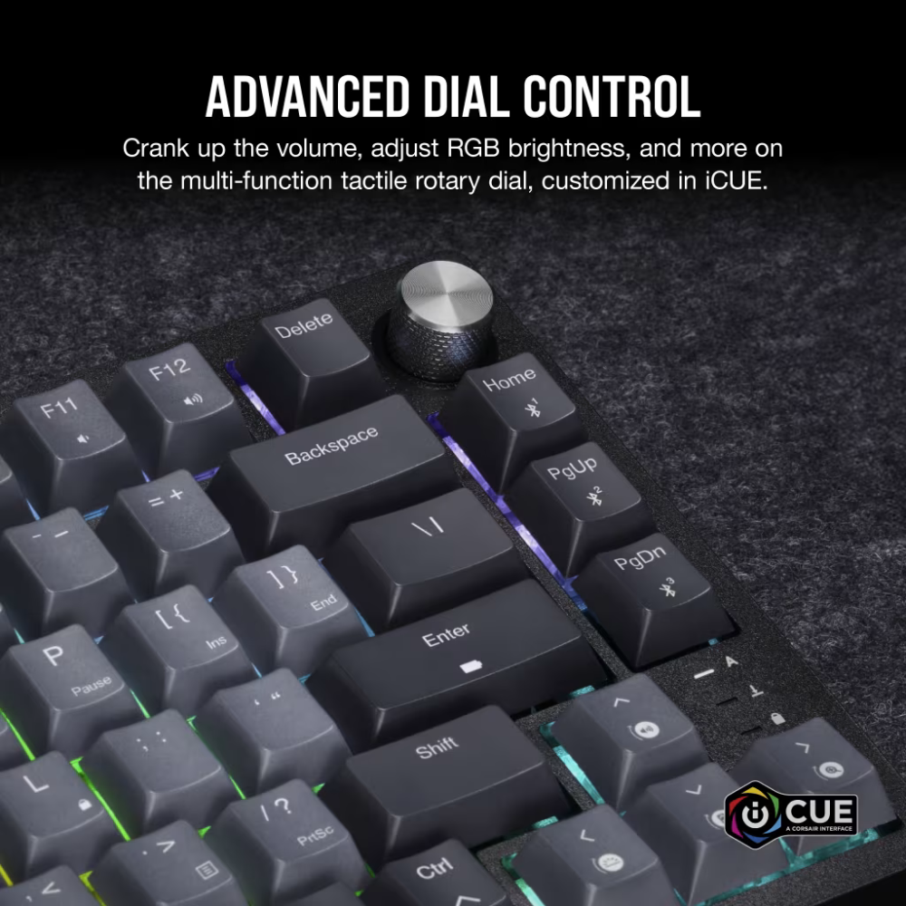 - More than just a volume knob. The multi-function dial is programmable in iCUE to adjust RGB brightness, zoom, scroll, and more.