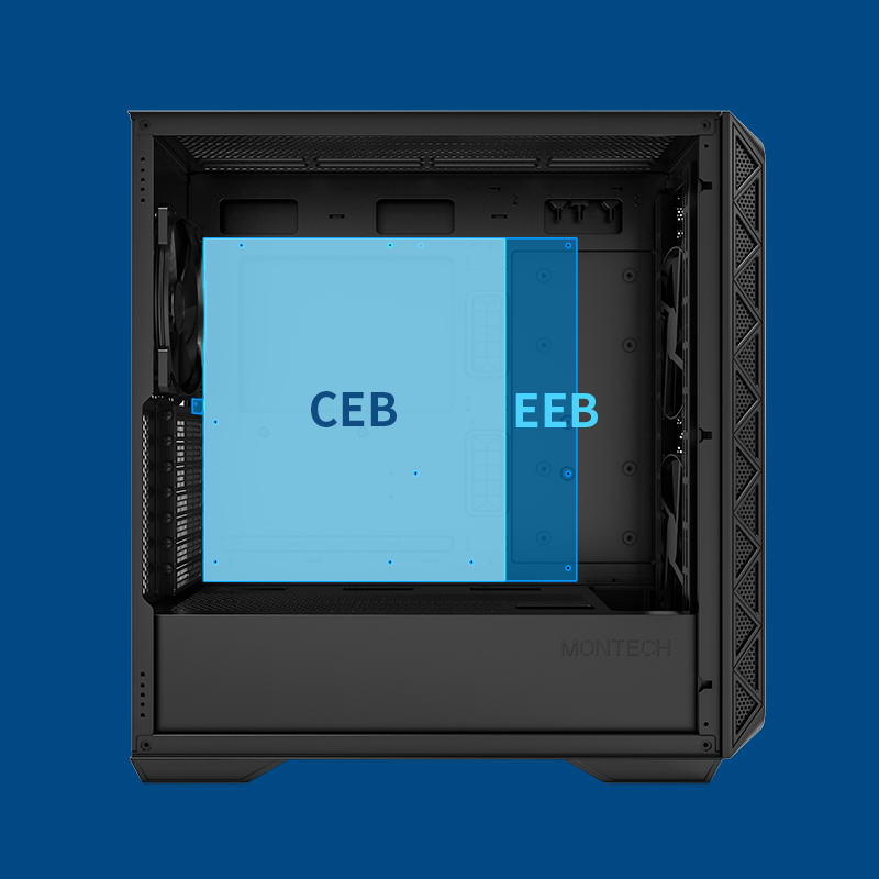 - Supports E-ATX and SSI-EEB form factors, providing a seamless installation experience with pre-punched mounting holes and cable routing holes.
