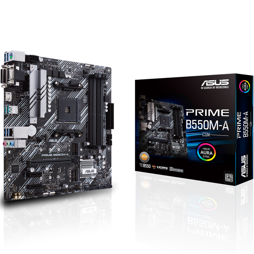 - AMD B550 (Ryzen AM4) micro ATX motherboard with dual M.2, PCIe 4.0, 1 Gb Ethernet, HDMI/D-Sub/DVI, SATA 6 Gbps, USB 3.2 Gen 2 Type-A, and Aura Sync RGB headers support