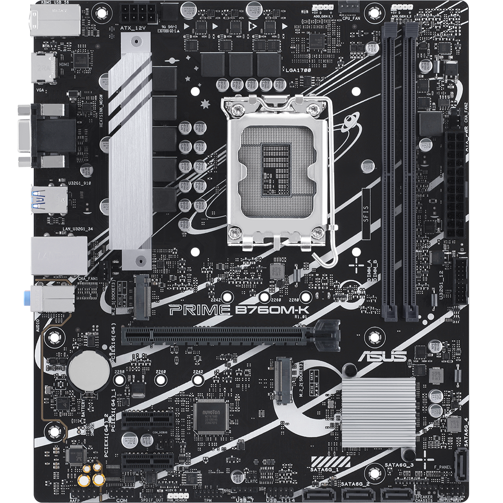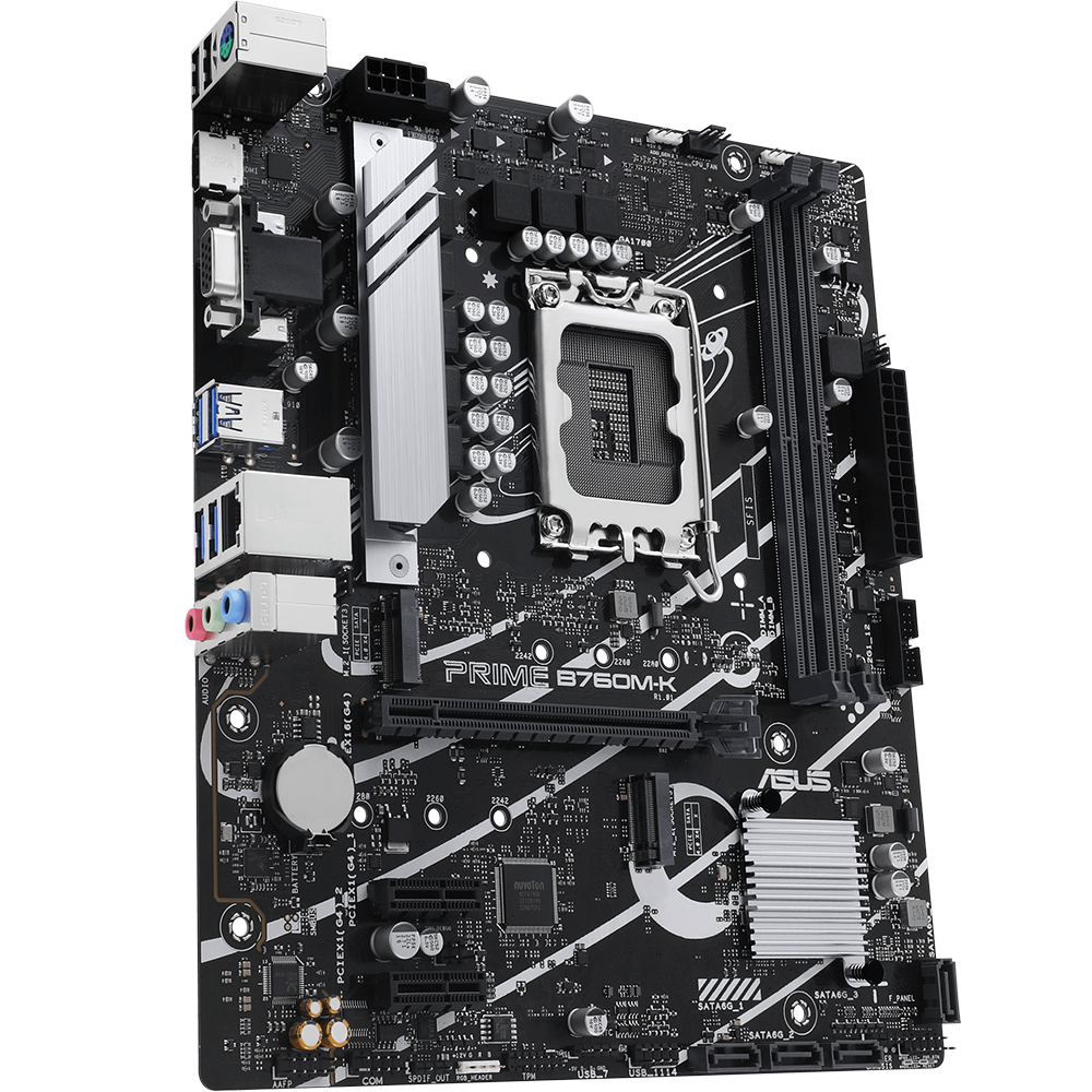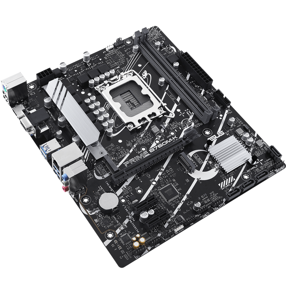 - ASUS Prime B760M-K, an Intel B760 LGA 1700 mATX motherboard with PCIe 4.0, two PCIe 4.0 M.2 slots, DDR5, Realtek 2.5Gb Ethernet, VGA, HDMI, SATA 6 Gbps, front USB 3.2 Gen 1, Aura Sync