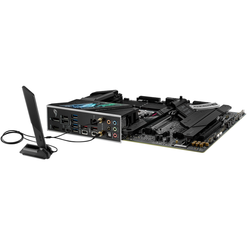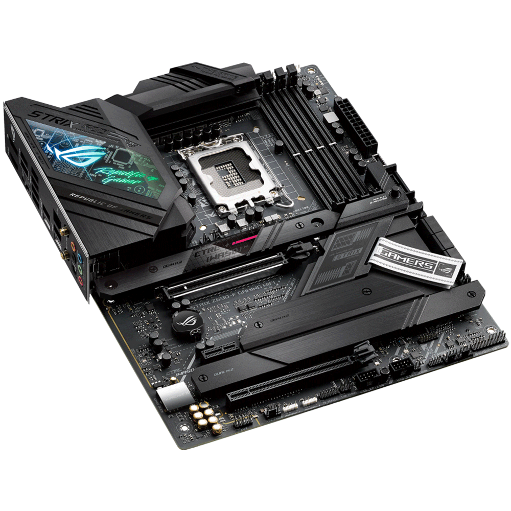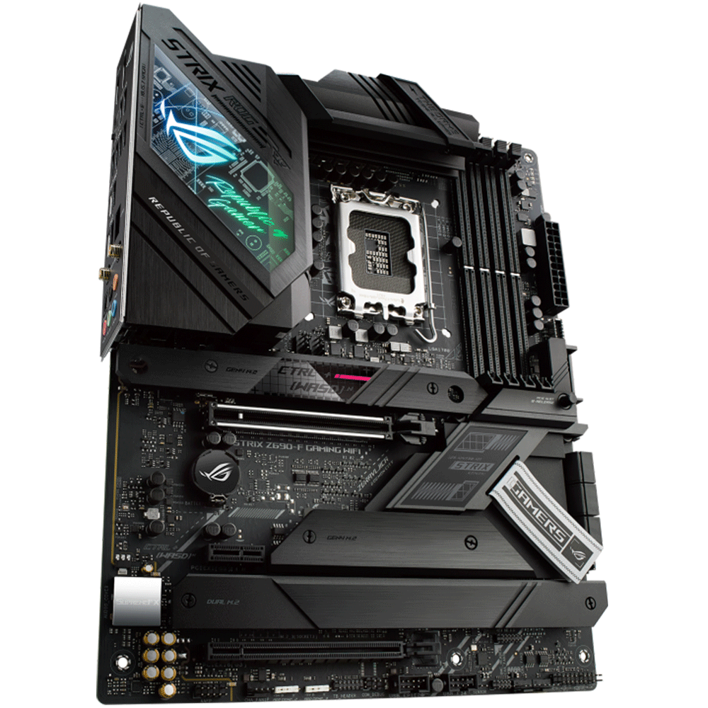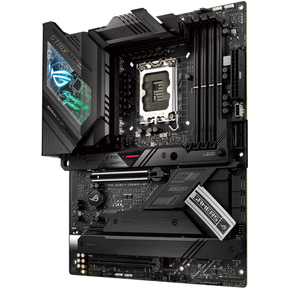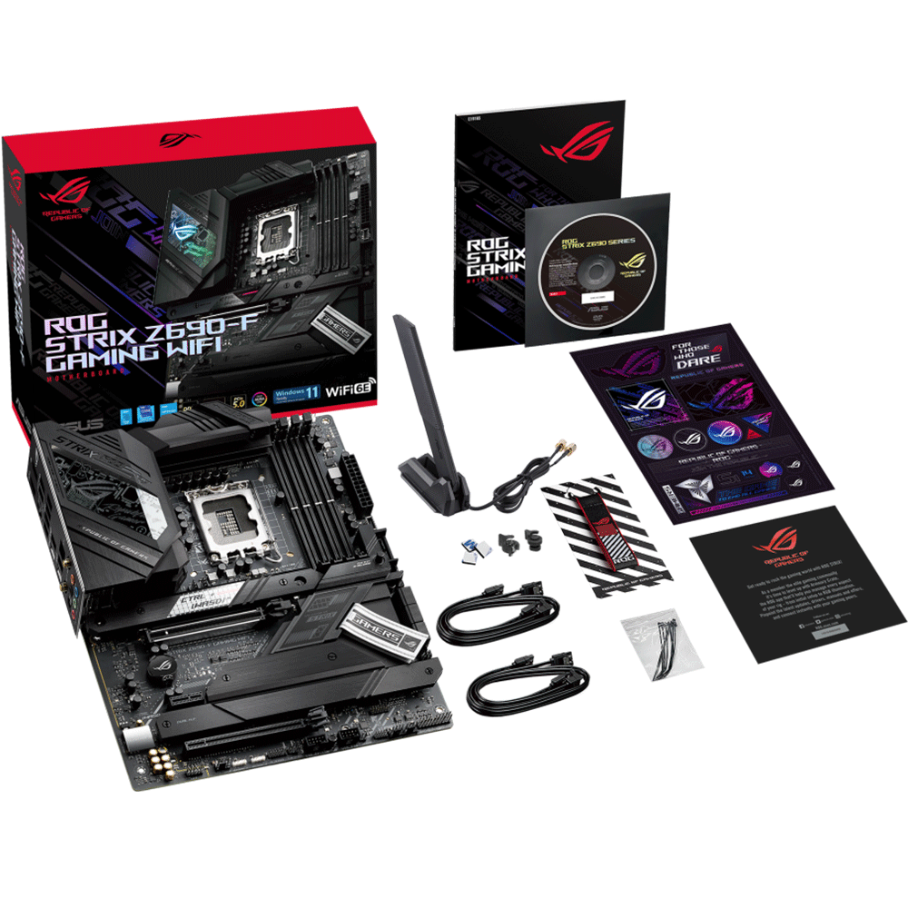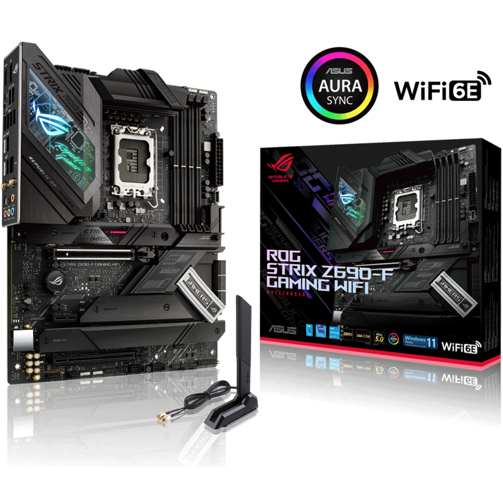 - Intel Z690 LGA 1700 ATX motherboard with PCIe5.0, 16+1 power stages, DDR5 memory support, Two-Way AI Noise Cancelation, AI Overclocking, AI Cooling, AI Networking, WiFi 6E (802.11ax), Intel2.5 Gb Ethernet, four M.2 slots with heatsinks, PCIe 4.0 NVMe SSD support, M.2 backplate, PCIeSlot Q-Release, USB 3.2 Gen 2x2 Type-C, SATA and Aura Sync RGB lighting