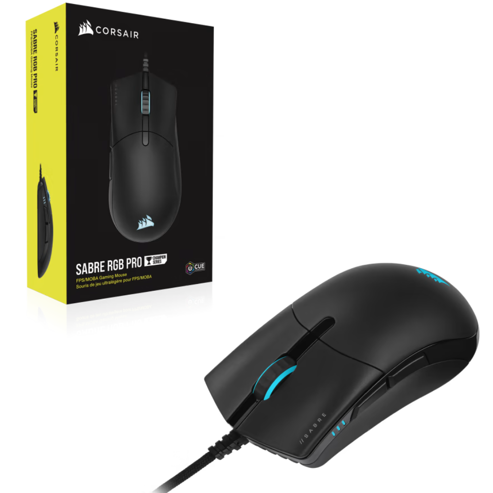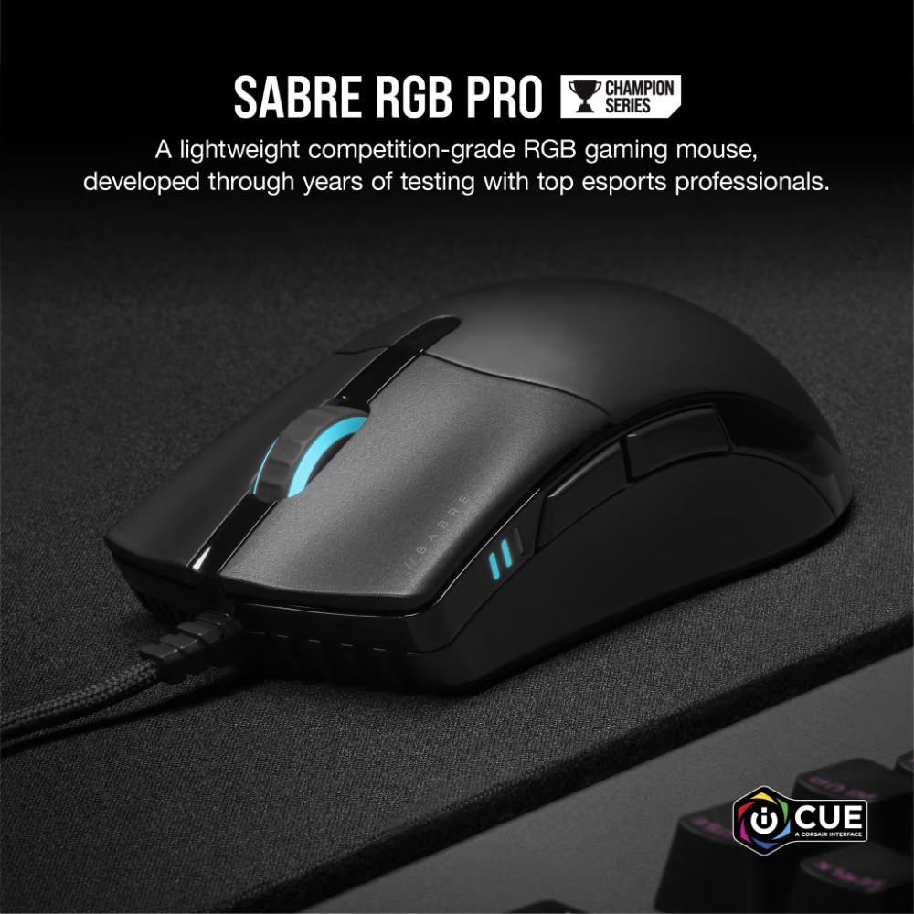 - The CORSAIR SABRE RGB PRO Gaming Mouse is designed with feedback from esports pros, weighing an ultra-light 74g and equipped with a drag-reducing flexible paracord cable for responsive, unhindered movements.