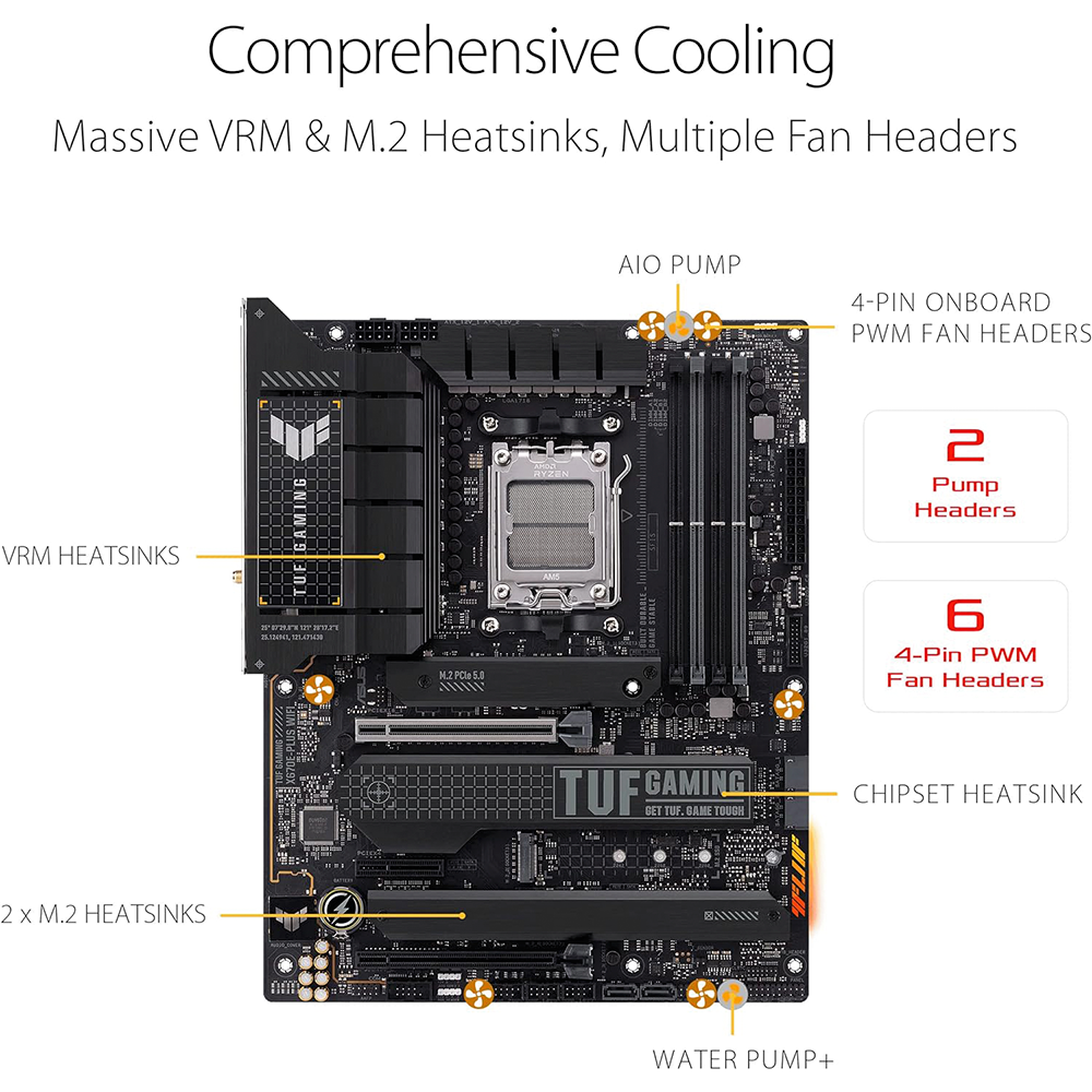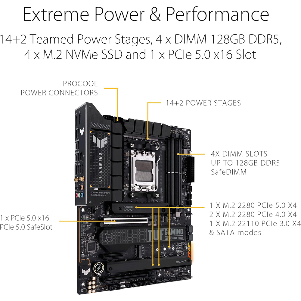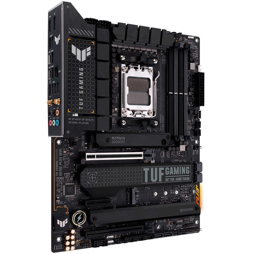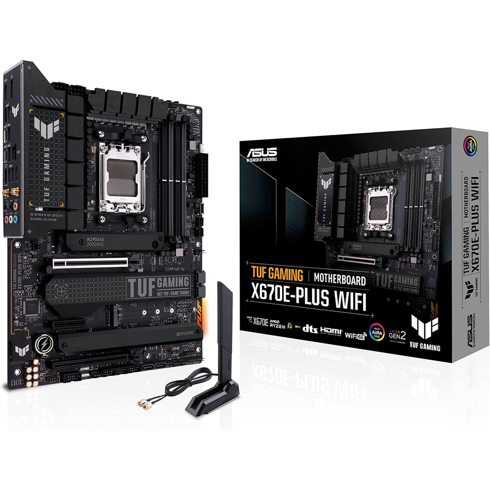 - ASUS TUF GAMING X670E-PLUS WIFI takes all the essential elements of the latest AMD Ryzen 7000-series processors and combines them with game-ready features and proven durability. Engineered with military-grade components, an upgraded power solution and a comprehensive cooling system, this motherboard goes beyond expectations with rock-solid and stable performance for marathon gaming. TUF GAMING motherboards also undergo rigorous endurance testing to ensure that they can handle conditions where others may fail. Aesthetically, this model incorporates rugged off-black and geometric design elements to reflect the dependability and stability that defines the TUF GAMING series.