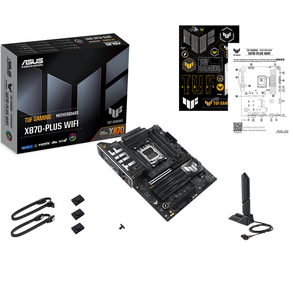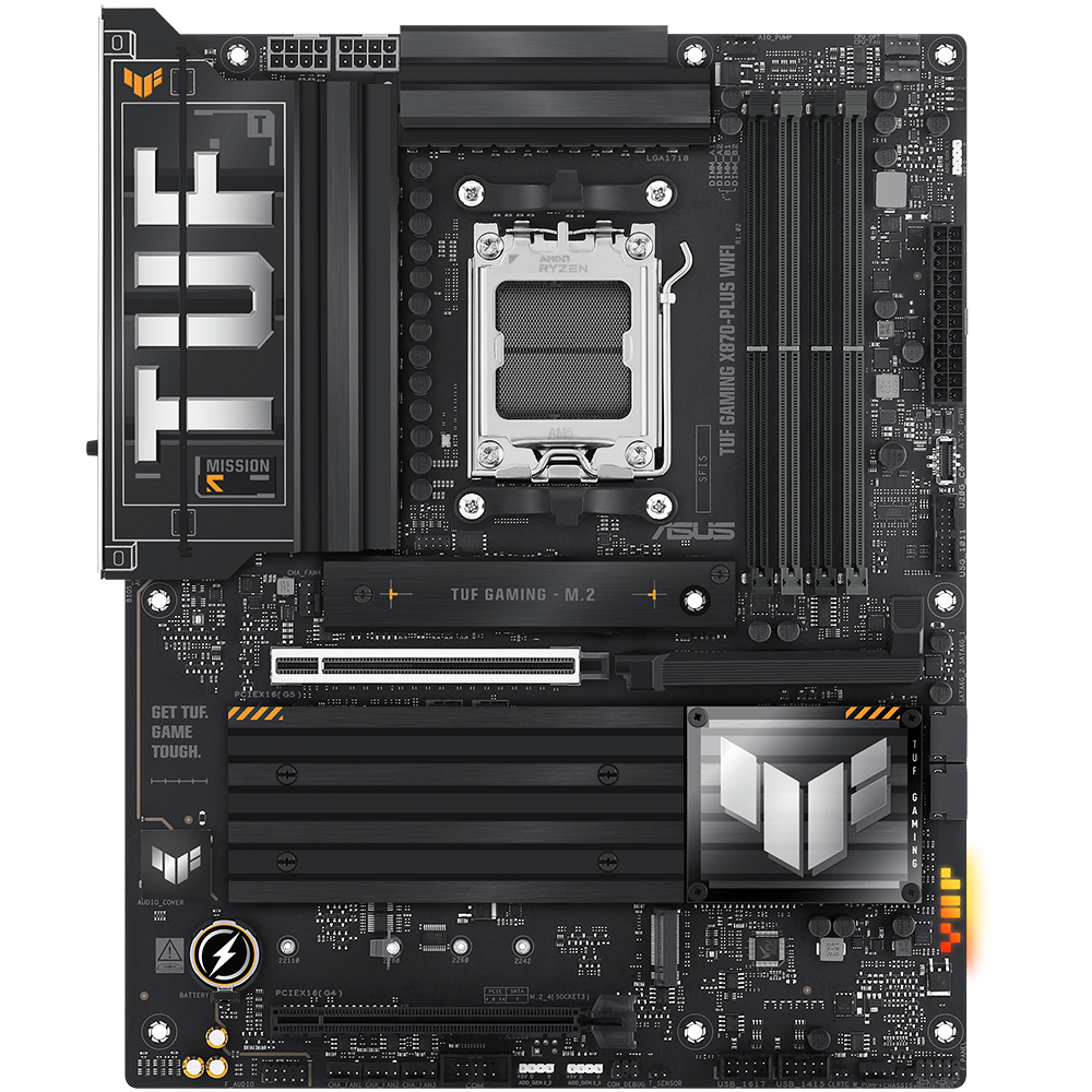 - ASUS TUF GAMING X870-PLUS WIFI takes all the essential elements of the latest AMD Ryzen processors and combines them with game-ready features and proven durability. Engineered with military-grade components, an upgraded power solution and a comprehensive cooling system, this motherboard goes beyond expectations with rock-solid and stable performance for marathon gaming. TUF GAMING motherboards also undergo rigorous endurance testing to ensure that they can handle conditions where others may fail. This platform delivers the power and connectivity that advanced AI PC applications demand.