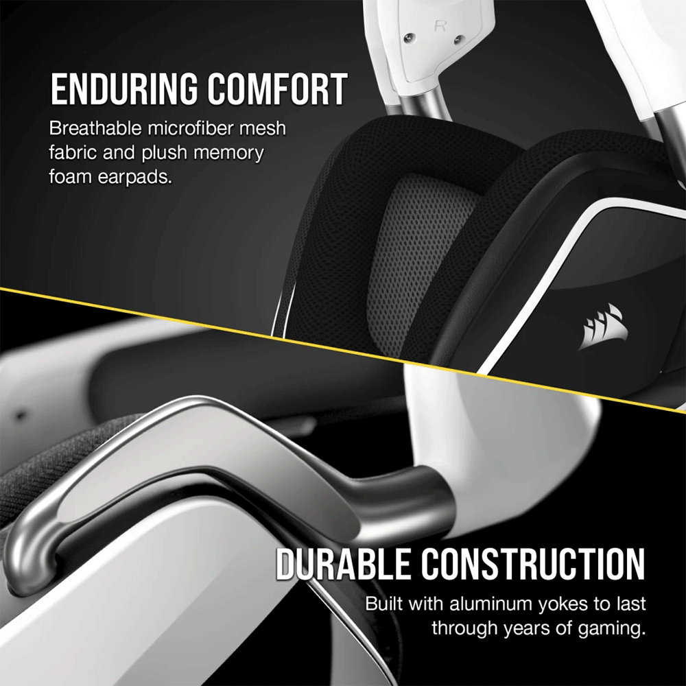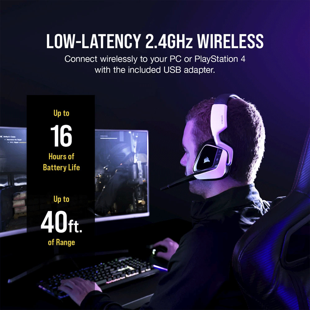 • Immerse yourself in the action with the CORSAIR VOID RGB ELITE Wireless, boasting custom-tuned 50mm neodymium audio drivers, comfortable microfiber mesh fabric with memory foam earpads, and a 2.4GHz wireless connection.
